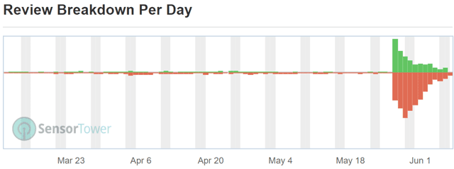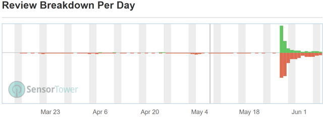 Using the graphs from Sensor Tower, one can easily see that the consumer experience with HBO Max has been weak. The red bars (negative reviews) far outweigh the green bars (positive reviews).