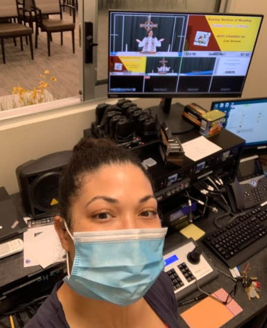Nicole Eison, Fitness Manager at Highland Springs, prepares to live stream a Sunday worship service led by Pastoral Ministries Coordinator Jamie Bruning on HSTV Channel 80.