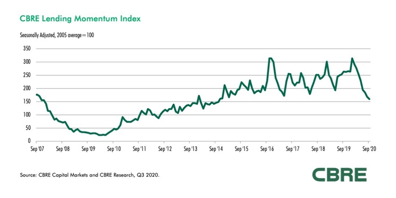 The CBRE Lending Momentum Index, which tracks the pace of commercial loan closings in the U.S., fell to a value of 160 in September, down 17.6% from June. As of September 2020, the index was down 39.4% from a year ago.