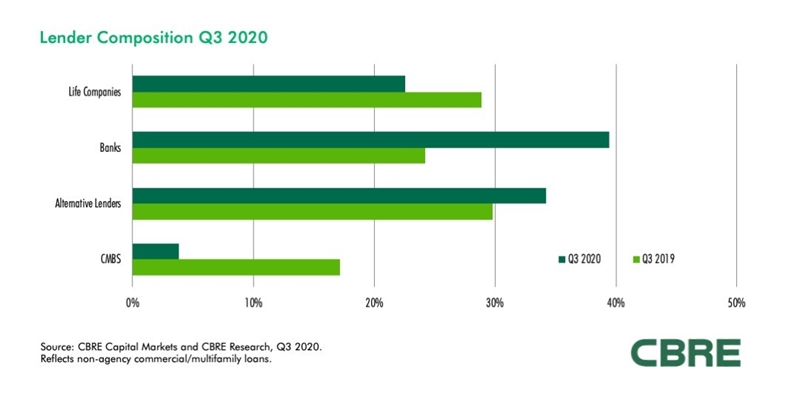 Alternative lenders (includes REITs, finance companies, debt funds), which did little lending in Q2 2020, accounted for 34% of loan volume in Q3 2020. These lenders closed a variety of multifamily and retail bridge and construction deals during Q3 2020.